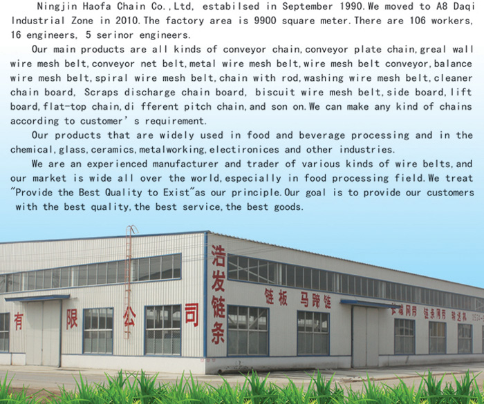 寧津縣浩發鏈條產品有各種不銹鋼網帶、各種輸送設備、網帶、鏈板、鏈條、輸送鏈板、馬蹄鏈(長城網帶)、輸送網帶、金屬網鏈、網帶輸送機、鏈板輸送機、乙型網帶、冷凍機螺旋網帶、橫桿鏈條、洗碗機網帶、清洗機鏈板、排屑機鏈板、餅干機網帶、擋板及提升式鏈板,平板鏈、大節距鏈條、大滾子鏈條等設備。我們浩發除了制作不銹鋼網帶、長城網帶等網帶產品和鏈板之外,我們同時精于制造各種非標鏈條、特種鏈條,非標輸送帶及鏈輪,亦可根據客戶需要,設計、制造各種生產流水線等。 寧津縣浩發鏈條有限公司始建于1990年9月,2010年遷址山東省寧津縣大祁工業園A8,總占地面積9900平方米,現有員工106名,其中技術人員16名,高工5名。是一家以生產鏈條,鏈板,輸送機為主的中型企業,本公司集模具開發、制作、生產、銷售等一條龍型生產企業。 我公司(浩發鏈條)技術力量雄厚,新產品開發周期短,檢測手段齊全。產品銷往各地。 承諾:做同行業中具有經濟競爭力的產品。優良的產品質量、良好的服務、及時快捷的交貨速度,滿足您對產品的需求。 我們期待著客戶的咨詢、考察、洽談業務,我們將熱忱為您提供服務。 歡迎您選用“浩發”產品。